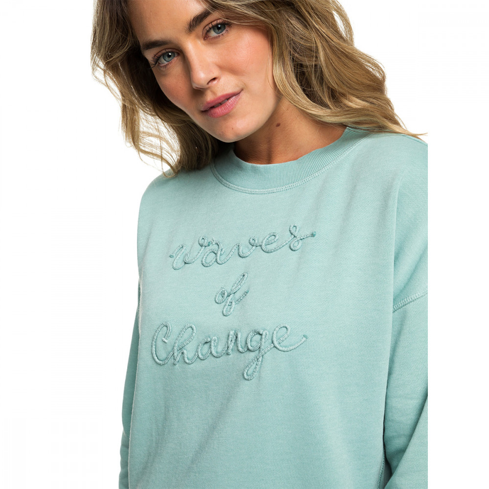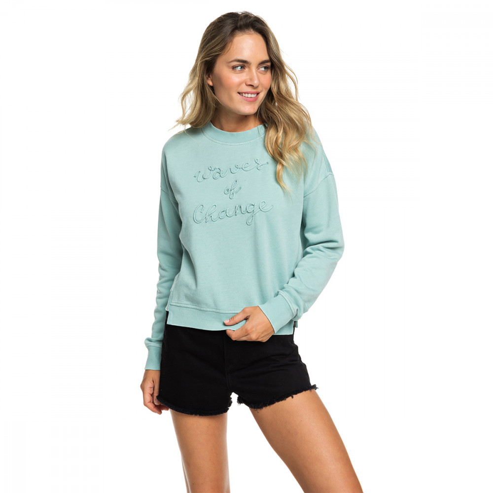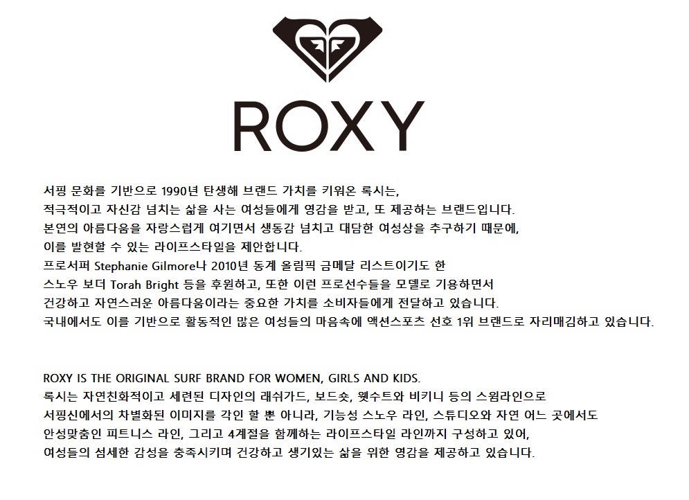 넓은 두께의 시보리와 가슴과 소매에 록시 로고가 프린트가 돋보인다.