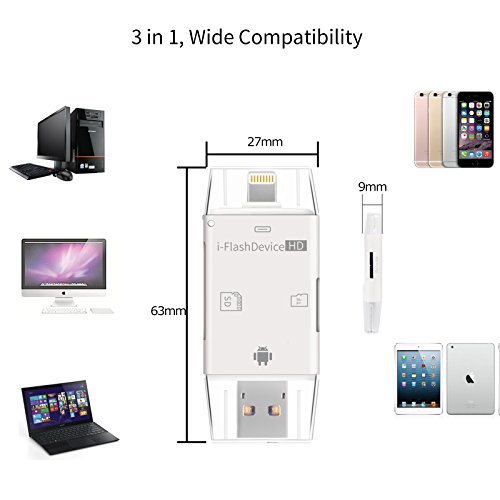 WIDE COMPATIBILITY. The memory card reader support device: iPhone/iPad/iPod/Mac/PC/Android Device/Digital Cameras. Support OS: IOS, Windows, Linux, Mac OS, Android. Support interface: Lightning, Micro USB, USB1.1/2.0/3.0.