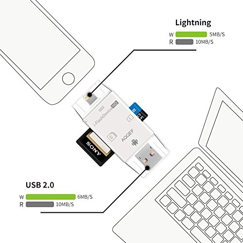 AQQEF 3 in 1 SD/Micro SD/SDHC/SDXC digital card reader for Lightning/Micro USB/USB. Features: - Free App from App Store for communication between your IOS Device and SD card reader. No need iTunes or Jailbreak.