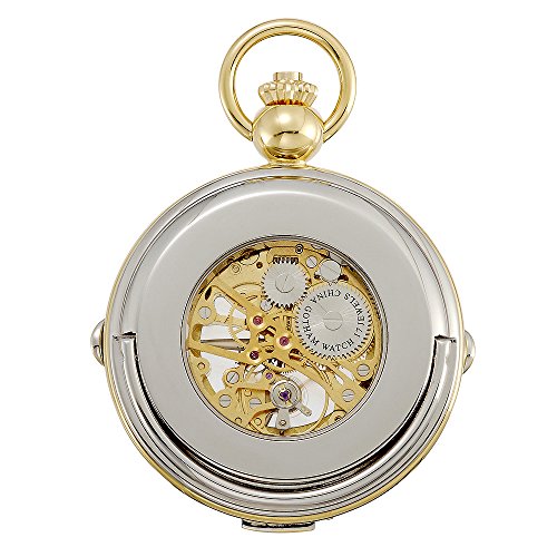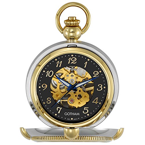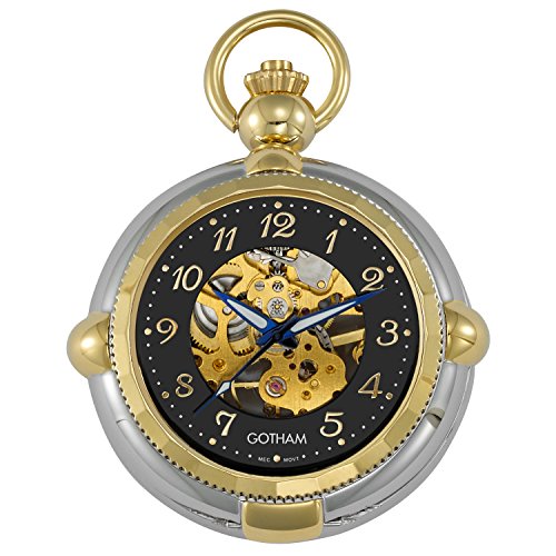 -. Binding : Watch -. Brand : Gotham -. Department : Mens -. Feature : Beautiful highly polished finished two-tone round case with intricate details plus see thru cover / Unique built in stand so you can display on desk or nightstand / Premier 17 jewel mechanical movement with exhibition front and back opening to display moving parts / Includes matching 14" curb pocket watch chain with sP.R.Ing ring attachment / Arrives with deluxe draw string pouch and gift box, Selvyt polishing cloth, operating instructions and lifetime limited warranty card -. Label : Gotham -. Manufacturer : Gotham -. MPN : GWC14062TA -. PackageQuantity : 1 -. PartNumber : GWC14062TA -. ProductGroup : Watch -. ProductTypeName : WATCH -. Publisher : Gotham -. Studio : Gotham -. Title : Gotham Men's Two-Tone Photo Insert Skeleton Pocket Watch with Built-in Stand # GWC14062TA