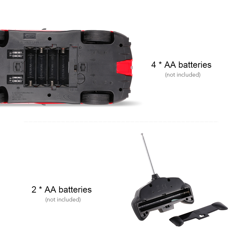 4 * AA batteries needed for car, 2 * AA battery needed for transmitter (not included)