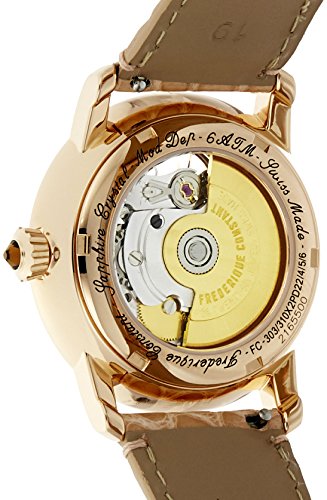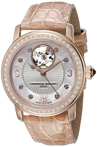 Rose gold-plated stainless steel case with a beige alligator leather strap. Fixed rose gold-plated set with diamonds bezel. Cut-out mother of pearl dial with rose gold-tone hands and diamond hour markers. Arabic numerals mark the 3, 6 and 9 o'clock positions. Dial Type: Analog. Automatic movement. Scratch resistant sapphire crystal. Pull / push crown. Skeleton case back. Case diameter: 34 mm. Case thickness: 9.9 mm. Round case shape. Band width: 19 mm. Band length: 7 inches. Tang clasp. Water resistant at 60 meters / 200 feet. Functions: hour, minute, second. Dress watch style. Watch label: Swiss Made. Item Variations: FC 310HBAD2PD4, FC.310HBAD2PD4, FC310HBAD2PD4. Frederique Constant Heart Beat Mother of Pearl Diamond Dial Beige Leather Ladies Watch FC-310HBAD2PD4.Feature