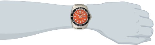 Orient Watch: Orient CEM75001M men's watch features brushed finish stainless steel case with black unidirectional rotating bezel and screw down crown & case back. This great watch also comes with high quality Japanese automatic movement, scratch resistant mineral crystal, water resistant up to 200 Meters, 8 1/2 inches brushed finish stainless steel bracelet with fold over safety clasp and orange dial with day-date display and luminous hands and hour markers.Feature