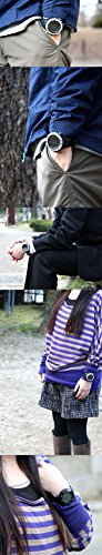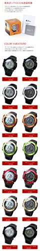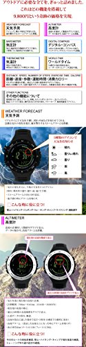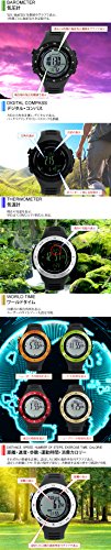 -. Feature : 全部で14色あります。この商品は 03.シルバーベゼル×通常液晶 になります。 / 〇素材 風防:ミネラルガラス ケース:プラスチック/ステンレス ベゼル:アルミニウム ベルト:ポリウレタン 〇サイズ ケースサイズ:約46x46x15mm 腕回り:約14cm~約22cm/ ベルト幅:約22mm 重さ:約65g 〇付属品 専用BOX 取扱説明書(日本語) ・駆動方式: 電池式 ・表示方式:デジタル ・裏蓋:ネジ留め式 ・防水:100m防水 ・バックル:穴留め式 / ■スイス製センサー搭載 ■距離・速度・歩数・運動時間・消費カロリーの計測/管理 ・歩数、移動距離、消費カロリーの3つから選んで目標を設定 ・設定した目標の進捗率を円グラフ表示 ・任意の場所でポイントを保存(最大30個)、ポイント間や全ポイントトータルの距離/速度/歩数/運動時間/消費カロリーと各ポイントの高度を確認可能 ・スマートラップ(設定した距離ごとに速度/歩数/運動時間/高度をポイントとして自動保存) ・ユーザープロフィール設定(年齢/性別/身長/体重) ・身長/体重の単位: cm,kg(メートル法)とft,lb(ヤードポンド法)組み合わせ対応 ■高度計 ・気圧を基に現在地の高度の計測(計測範囲:-706m~9164m, -2316ft~30067ft) ・現在地の高度の修正 ・過去24時間の高度をグラフで表示 ・山頂データの保存、確認(高度が頂点に達した場所で高さ・日時を10個まで自動的に保存) ・高度アラーム(設定した高度以上になった時) ・表示単位:m(メートル)、ft(フィート) / ■気圧計 ・現在地の気圧/海面気圧の表示・修正(計測範囲:300hPa/mb~1100hPa/mb, 8.85inHg~32.48inHg) ・1時間ごとの海面気圧を自動記録(過去24時間分まで保存)・履歴の詳細確認 ・過去24時間の海面気圧履歴をグラフ表示 ・表示単位:hPa mb(ヘクトパスカル ミリバール)、inHg(水銀柱インチ) ■デジタルコンパス ・方位(16方位)、方角(0°~359°) ・連続計測 ・東西南北ポインター表示 ・バックベアリング ・コンパスロック ・キャリブレーション(センサー偏りを修正)とデクリネーション(磁気偏差の修正)でコンパスの調整・修正 ■気温 ・現在の気温を表示(計測範囲-10°C~60°C, 14°F~140°F) ・単位: °C(摂氏)、°F(華氏) / ■天気予測 ・気圧の変化を元に、今後の天気を5つのアイコン(晴れ・晴れ時々曇り・曇り・雨・嵐)で予測 ・ストームアラームのON/OFF設定 嵐予測の時にアラームを鳴らす ■時刻表示 ・時、分、秒、月、日、曜日 ・12H/24H ・月-日または日-月の表示順選択 ・タイムゾーン選択 ・夏時間(DST) ■ワールドタイム ・プリセットされた59都市の現在時刻表示 ・ユーザー設定のタイムゾーンを1つ設定可能 ■カウントダウンタイマー ・6つのプリセット時間(1分、3分、5分、10分、15分、45分)とユーザー手動設定から1つ選びカウントダウン ・ユーザー設定は最大99時間59分59秒 ・10分を切ると毎分、1分を切ると10秒ごと、5秒を切ると毎秒音が鳴る ■アラーム: 2つ設定可能 ■時報:毎時0分に短く音を鳴らす ■ELバックライト ■コントラスト設定: 画面のコントラストを10段階で設定可能 ■操作音ON/OFF切り替え ■パワーセーブ ■電池残量低下アイコン表示