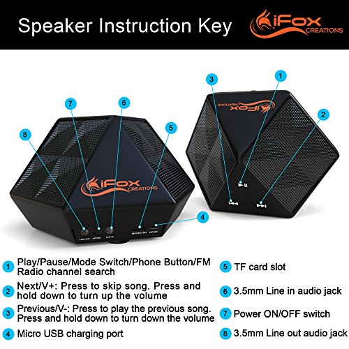 -. Binding : Electronics -. Brand : iFox Creations -. EAN : 0784672635844 -. Feature : CRISP, CLEAR, JAW-DROPPING SOUND - And classy looking too!! This 6 watt, 2 channel iFox portable mini speaker packs a real punch with amazingly crisp sound even when the volume is up full. Great for easy listening or to crank the party up with the booming sound you'd expect from a boombox! / VERSATILE INPUT + SPEAKERPHONE - 5 great functions - Switch between Wireless Bluetooth, Mini-SD/TF, FM Radio and AUX line (in & out) less than 6 seconds... or use the iFox as a speaker for that important phone call! You can easily control songs and adjust the volume at the speaker. And your portable Bluetooth devices will connect to the iFox from up to 33 feet away!! / SERIES LINKING CAPABILITY - You can link two or more of these speakers together to create an all-round sound. Great for a surround sound feel at low and high volumes. An Ultra-Portable speaker which you can move to the kitchen, garden, car, beach, pool, boat or campfire and get the party started wherever you go! / INCREDIBLE BATTERY LIFE - No more scrambling for the charger - With a powerful 1500 mAh rechargeable battery the iFox lasts for up to 8 hours playing time between charges. Plug it into the adapter, and it's fully charged again in under 3 hours! / 100% MONEY-BACK GUARANTEE FOR 1 FULL YEAR - We're so confident in our CE/FCC/ROHS Certifications we're offering a 100% money-back guarantee. You're taking on absolutely NO risk - use the iFox Bluetooth Speaker for 12 full months - if you don't like it, for whatever reason, we'll replace it or refund every penny of your purchase P.R.Ice! -. Label : iFox Creations -. Manufacturer : iFox Creations -. MediaType : MP3 -. Model : iFD8 -. PackageQuantity : 1 -. ProductGroup : Network Media Player -. ProductTypeName : PORTABLE_AUDIO -. Publisher : iFox Creations -. Studio : iFox Creations -. Title : iFox Creations IFD8 Bluetooth Portable Speaker with Stereo Sound-Wireless, TF Card, AUX, FM Radio + Speakerphone - Compatible with all Bluetooth Devices - Link Multiple Units - 8 Hour Battery Life -. UPC : 784672635844