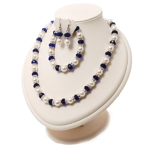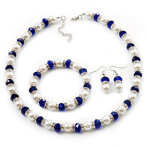 -. Title : White & Royal Blue Imitation Pearl Bead With Diamante Ring Necklace, Bracelet & Earrings Set (Silver Tone Metal)
