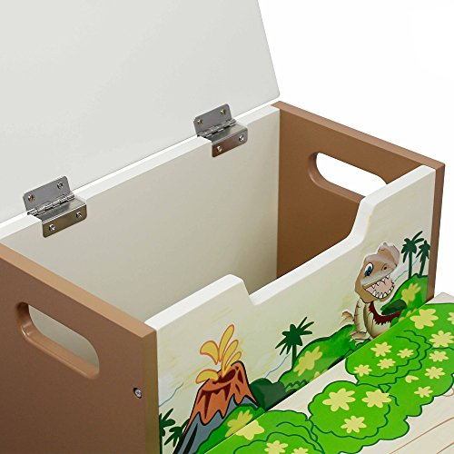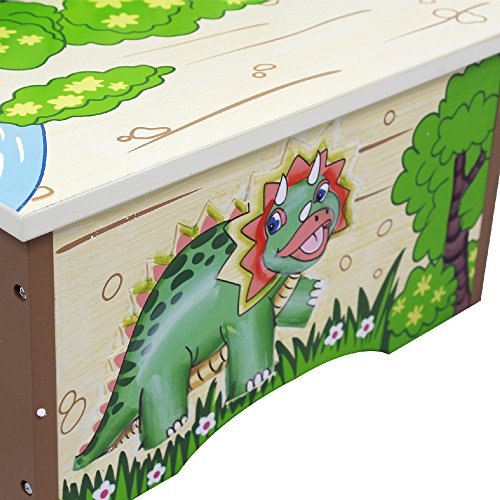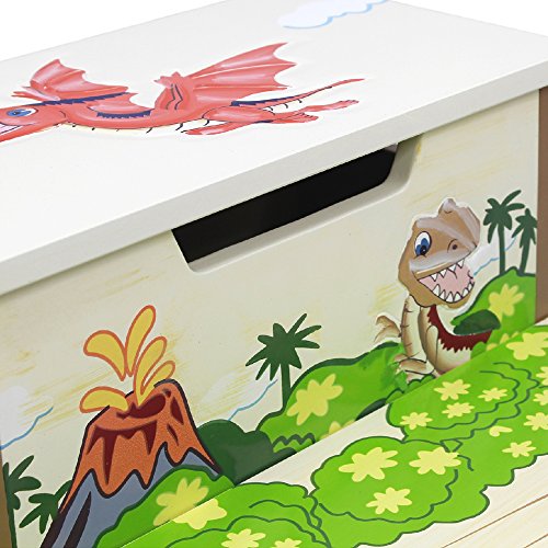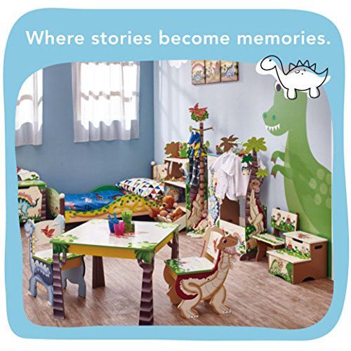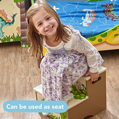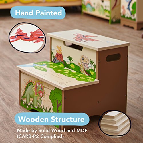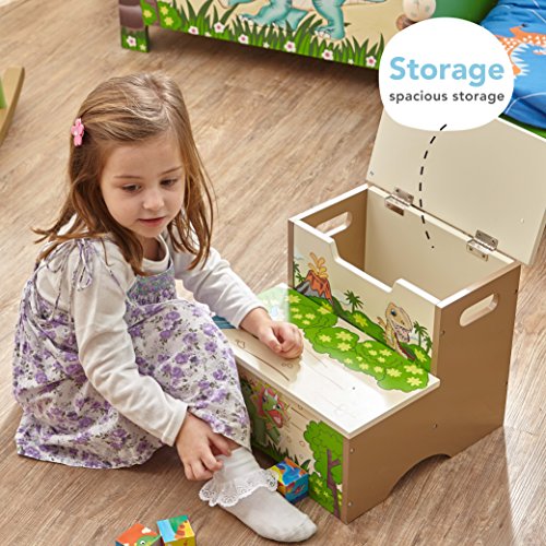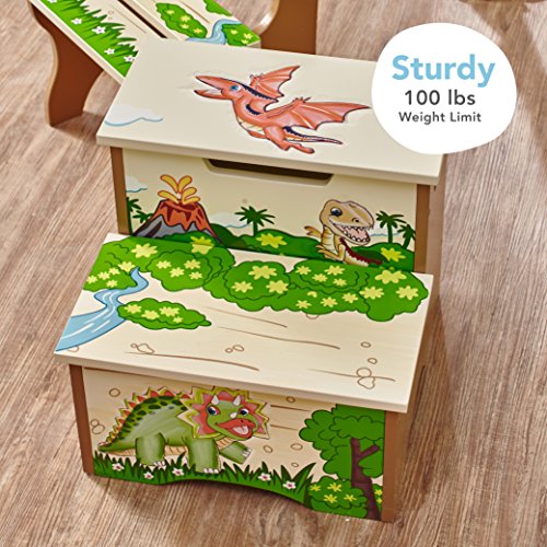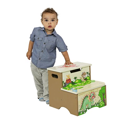 Have your child feel like the king of the Jurassic with Fantasy Fields' Storage Step Stool.Two steps of prehistoric fun, this step stool helps your child reach the sink to brush their teeth, or the top shelf of their book shelf to select a bed time story. Top of step stool features an orange Pterodactyl and two safety secure latches so lid closes slowly minding little fingers. The inside of the step stool is spacious, so things like games or small toys can be stored. With dinosaurs and a pretty landscape adorning the step stool, this makes for a great gift and a pretty sight! Some assembly required. Perfect for ages 3 and up.Feature