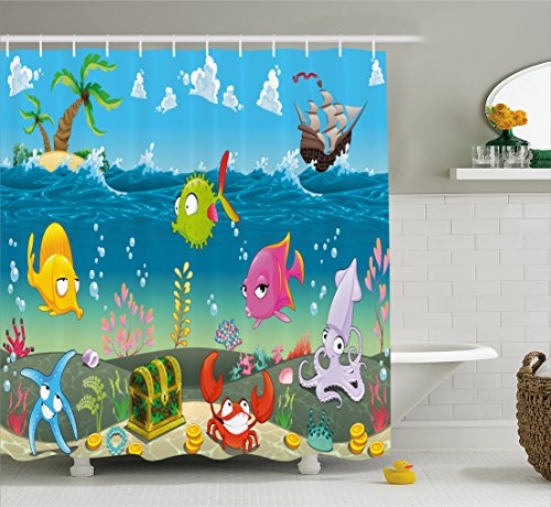 Kids Shower Curtain by Ambesonne, Funny Sea Animals Underwater Ocean View with Sail Boat Palm Trees Cartoon Artwork, Fabric Bathroom Decor Set with Hooks, 70 Inches, Multicolor
