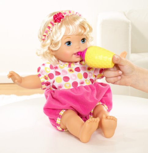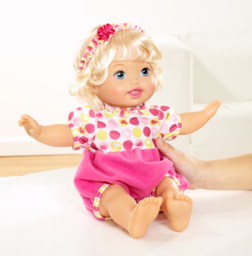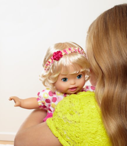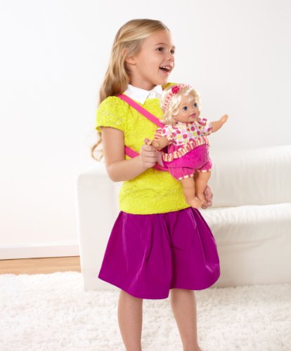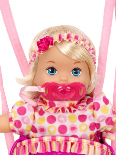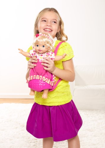 - Feature : It's a busy day on the go for little mommies. / Girls can carry her, feed her, change her, play with her and talk with her / Doll speaks more than 5 phrases and will make eating sounds when being fed. The switch has to be moved from ?Try-Me? mode to the ?On? position for normal play / Girls can rock her to sleep or take her out in the baby carrier / Includes doll, bottle, pacifier, food, teething ring, diaper, wipes and powder