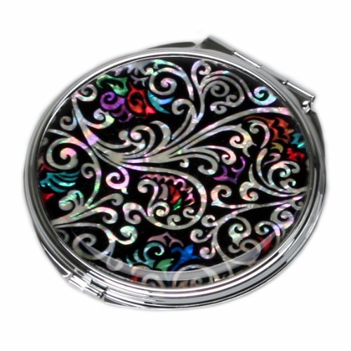Mother of Pearl Art Deco Black Round Double Compact Purse Makeup Cosmetic Pocket Hand Mirror, 3.2 Ounce