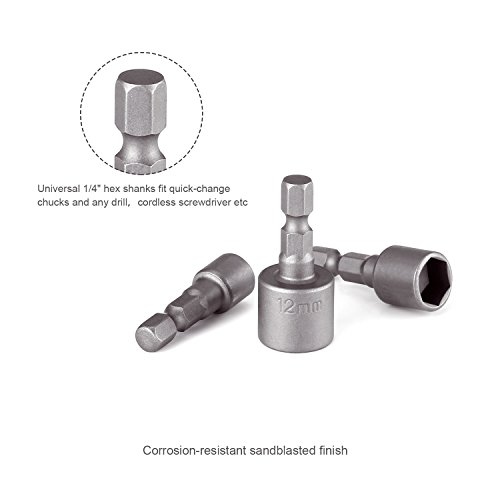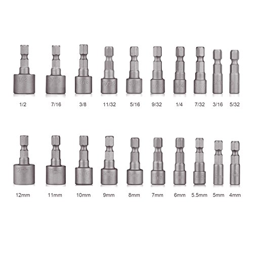 - ▲ 20 PCS SETS - 10-PCS Power Nut Driver Bits (Inch): 5/32, 3/16, 7/32, 1/4, 9/32, 5/16, 11/32, 3/8, 7/16, 1/2 in; 10-PCS Power Nut Driver Bits (Metric): 4mm, 5mm, 5.5mm, 6mm, 7mm, 8mm, 9mm, 10mm, 11mm, 12mm; Featuring a full range of sizes, can be used with any power drivers or screw-guns