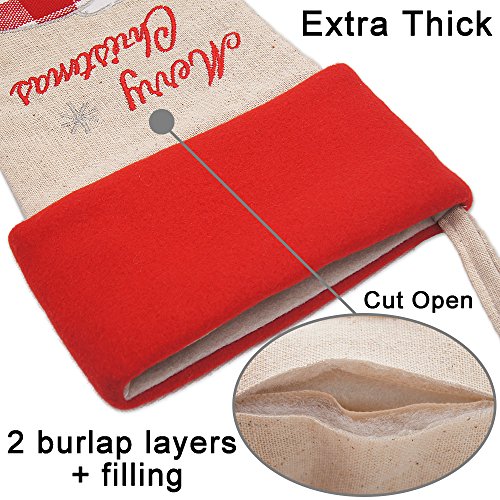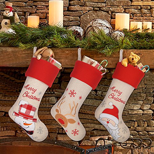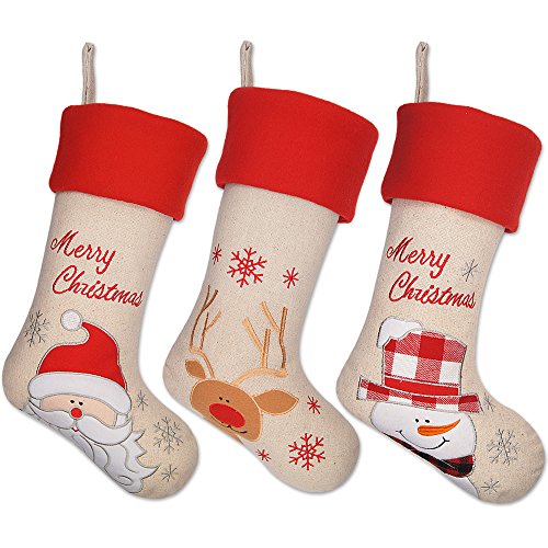 LimBridge 17" 3-Pack Rustic Burlap Christmas Stockings, Santa, Snowman & Reindeer