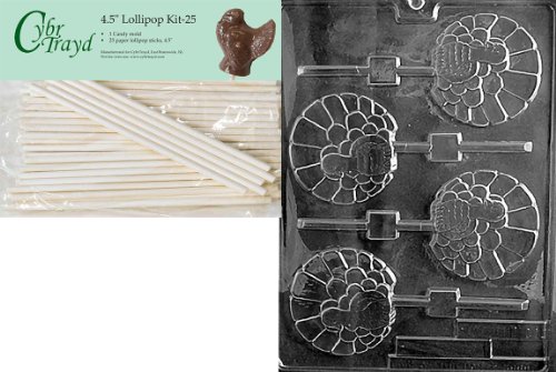 Cybrtrayd 45St25-T011 Fancy Turkey Lolly Thanksgiving Chocolate Candy Mold with 25-Pack 4.5-Inch Lollipop Sticks