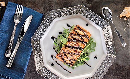 Studio : Lillian Tablesettings Publisher : Lillian Tablesettings Binding : Kitchen Product Description Lillian Table settings White Lacetagon 9.25-Inch Plate with Silver Rim, 10 Count. This item coordinates with our other items: Plates, Bowls, Cups, Napkins, Cutlery Table covers. Disposable. Designed for all occasions, banquets, dinners, parties, upscale catering and home. 0