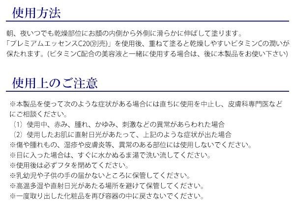 ミツロウ、ヒマワリ種子オイルなど、自然由来の成分を配合した保湿クリームです。ビタミンCとの相性が抜群!!別売の『プレミアムエッセンスC20』を使用後、重ねて塗るとビタミンCの潤いが保たれます。スーッと伸びてサラリとした使用感です。 |