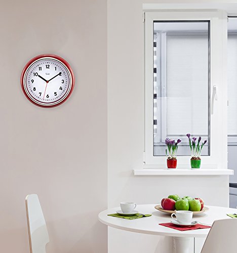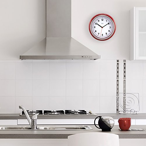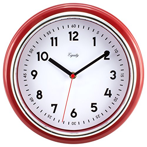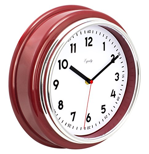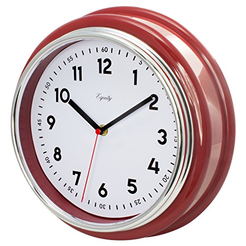 -. Binding : Kitchen -. Brand : La Crosse Technology -. Feature : Dimensions: 11.42L x 3.15W x 11.42H in. / Marsala colored plastic case with chrome bezel / 5 second intervals are marked / Hands are black metal / Silent sweep movement -. Label : LaCrosse Technology -. Manufacturer : LaCrosse Technology -. MPN : 20867 -. PackageQuantity : 1 -. PartNumber : 20867 -. ProductGroup : Home -. ProductTypeName : HOME -. Publisher : LaCrosse Technology -. Studio : LaCrosse Technology -. Title : Equity by La Crosse 11.5 in. Red Retro Wall Clock