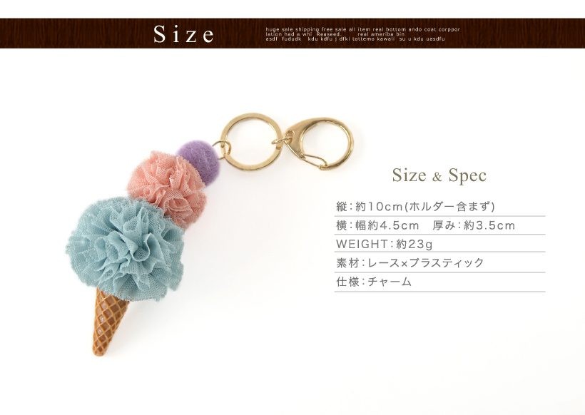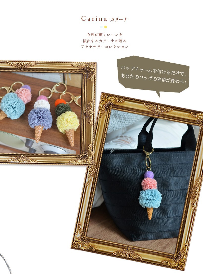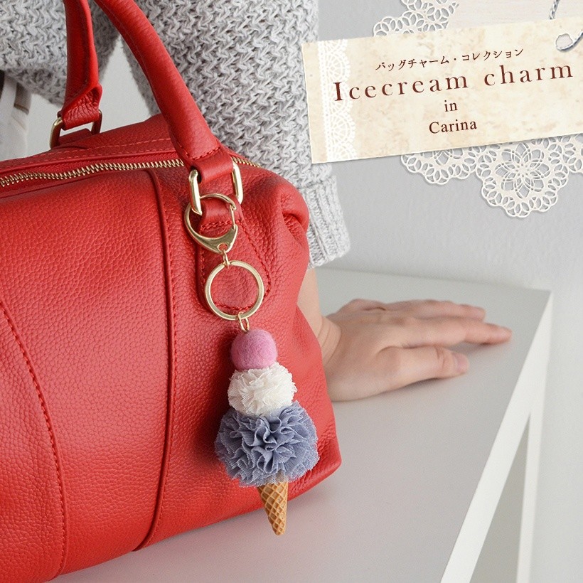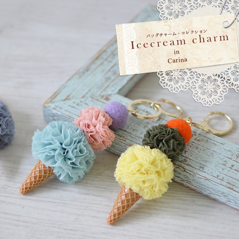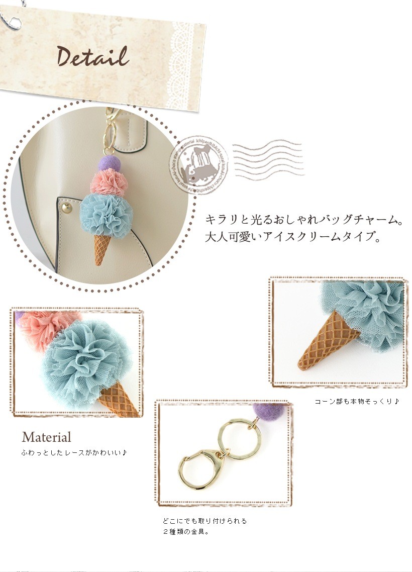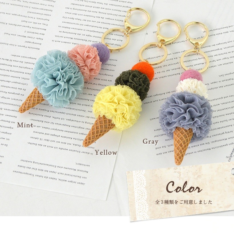 大きさの違うレースのポンポンを重ねたアイスクリームチャーム 女性が大好きなおいしそうな色合いのアイスクリームを3つ重ねた可愛いバッグチャームです。●SIZE: 縦:約10cm(ホルダー含まず) 横:幅約4.5cm 厚み:約3.5cm●重さ:約23g●素材:レース×プラスティック●仕様:チャーム●カラー:グレー・イエロー・ミント