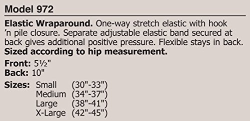 -. Feature : Elastic Wraparound Lumbosacral / Hook 'n pile closure / Flexible stays / Front Height: 5-1/2" -- Back Height: 10" / Sizes: Small, Medium, Large, X-Large