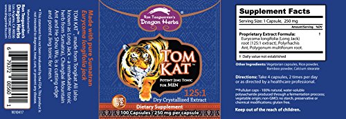 -. Binding : Health and Beauty -. Brand : Dragon Herbs -. EAN : 0679372005601 -. Feature : Libido and passion enhancing / Formula includes 80% 50:1 Sumatran Tongkat Ali, 10% He Shou Wu and 10% Chiangbai Mountain Ant Powder / Has a measurable and obvious pro-sexual effect / Has the reputation of letting a man have the same quality of sex they enjoyed in younger years / TomKat does not have the side effects that are quite common with herbal and pharmaceutical "aphrodisiacs" -. IsAdultProduct : 0 -. Label : Dragon Herbs -. Manufacturer : Dragon Herbs -. PackageQuantity : 1 -. ProductGroup : Health and Beauty -. ProductTypeName : HEALTH_PERSONAL_CARE -. Publisher : Dragon Herbs -. Studio : Dragon Herbs -. Title : Dragon Herbs TomKat -- 500 mg - 100 capsules -. UPC : 679372005601