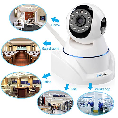 ROCAM NC400 Wireless IP Cameras Mega Pixel Pan Tilt WiFi Home Security Cameras with IR-Cut,11pcs IR LED,IR Irradiation Distance Up to 30ft, Two Way Audio,iPhone / Android, 32G SD Card Slot,Motion Alerts via E-mail or FTP White. High HD video quality:finest 1280 x 720P image quality,produce fluent playing video and maximum clarity of surveillance. Expect that,you can view real-time feed of almost every corner of your home with its digital zoom and remote pan and tilt features.