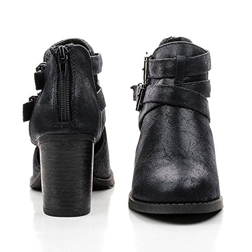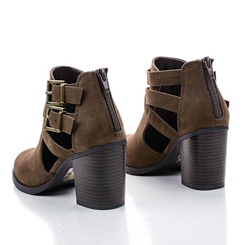 (Myra Dresses)/Women's/Boots/DIRECT FROM USA/Women's Round Toe Dual Buckle Block Stacked Heel Ankle Bootie with Cutout Sides