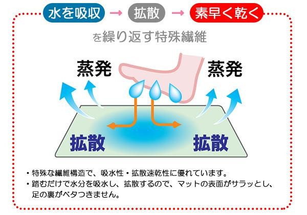 | 特殊な繊維構造で、吸水性・拡散速乾性に優れたバスマットです。踏むだけで水分を吸収・拡散するので、マットの表面がサラッとし、家族で使っても足の裏がベタつきません。また、裏面が床にピタッと吸着しマットのズレを防ぎます。芯材が入っていてフワッとした踏み心地で、ネットを使えば洗濯機で洗うことが可能です。 |