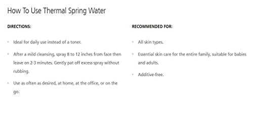 Thermal Spring Water to soothe and soften skin. Rich in Selenium, a powerful natural antioxidant. Gentle, fine mist of micro-droplets. Last step in cleansing, first step in caring, to tone and refresh skin. Essential skin care for the entire family, suitable for babies and adults. Suitable for all skin types including sensitive skin. Additive-free.Feature