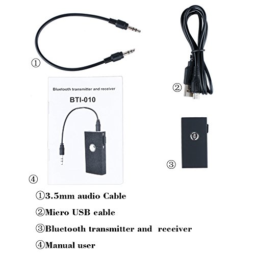 -. Binding : Electronics -. Brand : BaiLe -. Color : black -. EAN : 0758910679419 -. Feature : 2-In-1 bridges your Bluetooth device to your speakers or your Bluetooth speakers to your audio device / Simple one-button switch to shift between transmitter(TX) and receiver(RX) mode. TX Mode:Plug in to your non-Bluetooth device and pair up your Bluetooth speaker or headset. RX Mode: Plug into your non-Bluetooth speaker and pair up your Bluetooth Phone or MP3 Player / Bluetooth-enable all 3.5mm media devices (enable Bluetooth receiving: speakers, headphones and more; enable Bluetooth transmission for: MP3, CD / DVD players, e-readers, TVs and more) / Built in battery for portable use, or fast-charging through the USB cable, BUT it can not be used while charging / Ideal for any powered speakers or devices using standard RCA or 3.5mm jack or AD2P Bluetooth -. Label : Baile -. Manufacturer : Baile -. Model : BTI-010 -. PackageQuantity : 1 -. ProductGroup : PC Accessory -. ProductTypeName : NETWORKING_DEVICE -. Publisher : Baile -. Studio : Baile -. Title : Baile 2-In-1 Wireless Portable Bluetooth Transmitter and Receiver BTI-010 Audio Music Streaming Switchable with 3.5mm Stereo Output for Speaker, iPhone, TV, PC (black) -. UPC : 758910679419
