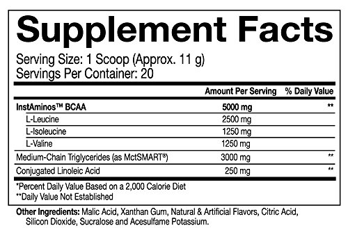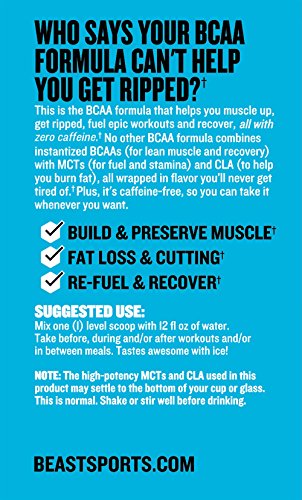 Ripped Black provides five grams of properly instantized Branch Chain Amino Acids (BCAAs) that quickly dissolve in water, leading to faster absorption in the body.* This formula uses a clinically tested and proven BCAA 2:1:1 ratio that closely mimics what is found in your body.* Beast takes this workout formula a step further by adding 3 grams of MCTs and 250 mg of CLA, making this product the first to include both CLA and MCTs.* The inclusion of MCTs removes the need for caffeine or other stimulants, as it provides a great source of real energy.* The addition of CLA in BCAA Ripped Black is another healthy fat that stimulates your metabolism to burn fat.*