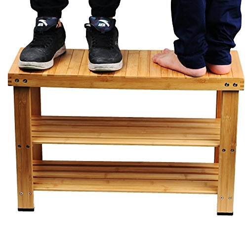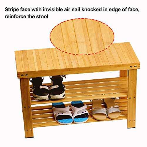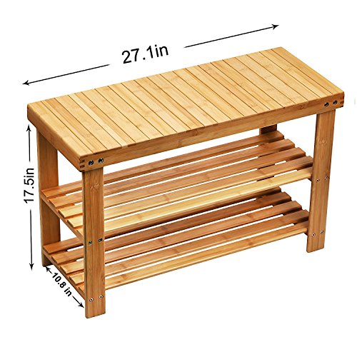 -. Feature : Bamboo Bench: Made of High Grade 100% Natural Bamboo and safe lacquer finish, Environmental Friendly and sturdy. / Multifuctional:Bench to sit down.2 tiers bamboo rack & storage bench for shoes, bags, plants,towels,shampoos,etc. / Space-saving:Use in entryway, bedroom, closet,wardrobe, cabinet, garage,foyer,etc.Please keep it dry after use in toiletries, bathroom. / Easy Assembel and Disassembly: Antirust and durable screws can be installed and disassembled repeatedly, tools provided. / Dimension: Length 27.1" x Width 10.8" x Height 17.5".Weight capacity:300lb.