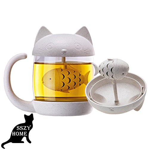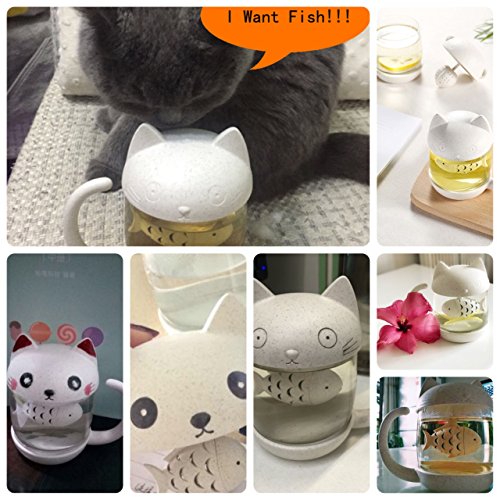 -. Feature : ★Eco-Friendly★: No Plastic! Wheat Straw + Glass! The whole cup is made of Wheat Straw and high borosilicate glass. Valley Fiber inside wheat straw is environment friendly, Non-toxic, safe, healthy material and it will naturaly decompose without any Toxic Chemicals after abandon. When you get it, you will love the smell of natural grain. Glass can bear -20℃-200℃, Durable heat anti-burst and explosion proof. / ★3D Cute Cat★: Amazing home decoration,popular with any age people. The cup just like a cute cat eat fish into its belly. The cup cover is the head of cup with two cat ears, cartoon cat ear shape make cat more vivid. The cat tail is designed as cup handle keep you away from heat injury. Send it as a gift , all kinds of people will love this cute cat. / ★Fish Filter★: A Swimming little fish filter inside the cup. The fish filter is easy to spin off, install and clean after using. You can put anything you like inside, just like coffe sugar, scented tea, fruit tea, green tea, herb tea, slim tea, flower tea, salad jucie and so on. When you pour the water in, you can see the fish swimming inside the waving water. / ★How to use★: When you get the cup, we advice you wash the whole cup. You can open the fish filter from the small gap between fish head and body, then make tea small and set in. The Cup lid is not screwed, so we suggest you drink your hot tea in 30min. / ★Size★: Without cat tail the cup size is 3.2 * 3.2 *5.5 In handsize, manual measurement, There may be about 2cm error. The Capacity of cup is about 8.5oz (250ml), middle size. 5 X 3.4 X 4.7 In Paper box with A Cat Tea Cup, perfect gifts for your family and friends. Every cup will be check by our hands and eyes to guarantee the quality of each cup. if there are any problems or recommendation, please contract us, we are waiting for your sounds and will reply to you as soon as possible.