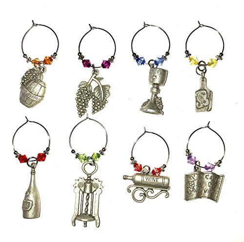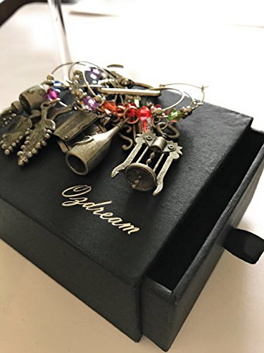 Studio : Ozdream Publisher : Ozdream Product Description Ozdream's Wine Charms are unique and enough to identify one's own wine glass at a party. Each piece in the set has a different design. Ozdream's metal plate Wine Charms are perfect gift for wine lovers. Set comes with hook holder and high quality gift box. Number of Pieces: 8 NOT safe for dishwasher. 0