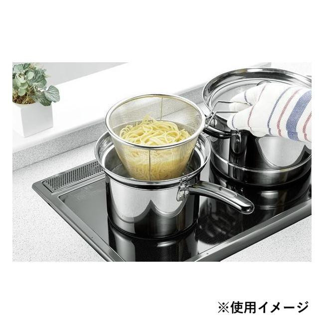 fk094igrjsザル付で用途が広がる深型片手鍋です サイズ W36.7×D21.6×H16.3cm 個装サイズ:36×22×16cm 重量 約960g 個装重量:1240g 素材・材質 本体:ステンレス鋼(板厚0.5mm) ザル:18-8ステンレス鋼 蓋:強化ガラス ハンドル・ツマミ:フェノール樹脂 仕様 容量:4L IH対応(200V) 製造国 中国 毎日使いにうれしい多用途お鍋 【ここがポイント】 (1)用途が広がる片手ザル付 ●パスタや麺類をゆでるときに湯切りが簡単 ●野菜の湯どおしや下ゆで、レトルト食品にも便利 ●脚付きなので鍋から出しても食材が下につかず衛生的 (2)深型で容量たっぷり縁の広がったふきこぼれにくい構造 (3)鍋の内側は目盛付なので、調理をする際に役立ちます(500-1000-1500) (4)調理中でも鍋の中の料理が見える便利なガラス蓋付 (5)IH200V対応もちろんガスコンロでもご使用いただけるオール熱源対応 段付構造だから 吹きこぼれにくい ザル付きで用途が広がる 麺類、ゆでもの、レトルト食品等、用途は色々 鍋内部には 便利な目盛付 ザル付で用途が広がる深型片手鍋です
