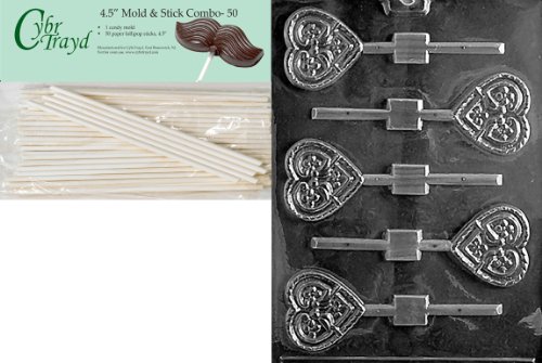 Cybrtrayd 45St50-V073 Love Birds Heart Lolly Valentine Chocolate Candy Mold with 50 4.5-Inch Lollipop Sticks
