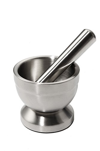 -. Feature : Mortar and pestle grinds and crushes herbs, nuts, and spices / Double stainless steel construction is extremely durable and compact / Functional Design with Non-Skid Base and Heavy-Duty Pestle Press / Mortar & pestle is food safe, sans BPA, lead, and mercury / Stain, odor and crack resistant