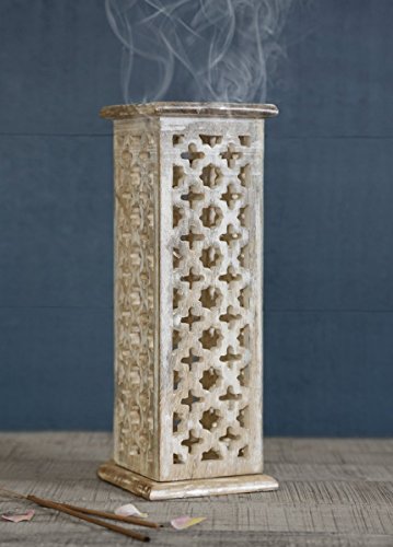 Handcrafted from durable Mango wood with a white finish, this incense stick holder has a slender tower shape with jaali work and multiple holes for holding incense sticks.