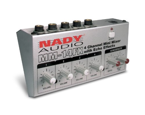 Studio : Nady Publisher : Nady Product Description This mini line mixer is complete with echo effects, delay time and depth controls, and has up to 50dB of gain per channel. It has four 1/4" mono inputs with individual volume controls and a 1/4" unbalanced output. 0