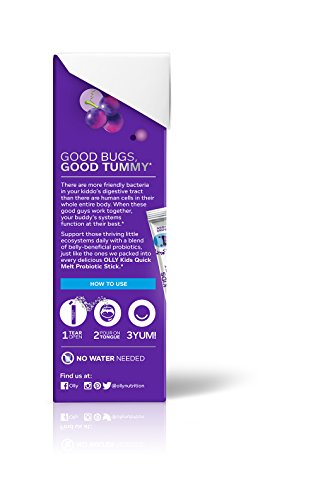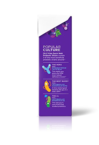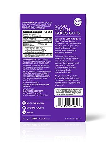 Say hello to OLLY Kids Quick Melt Probiotic Sticks, a super delicious, multi-tasking blend of good bugs to help boost and support your kiddo's digestive health and overall wellness. Balancing little bellies is essential for happy digestion and a healthy immune system. Each yummy stick delivers 5.5 billion live cultures from a blend of three scientifically researched strains. They're perfectly portable and totally tasty, so it's easy to support happier tummies, healthy immune systems and big grins.Feature