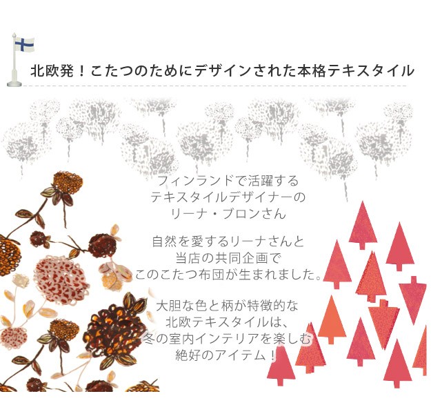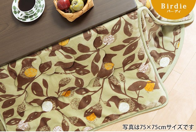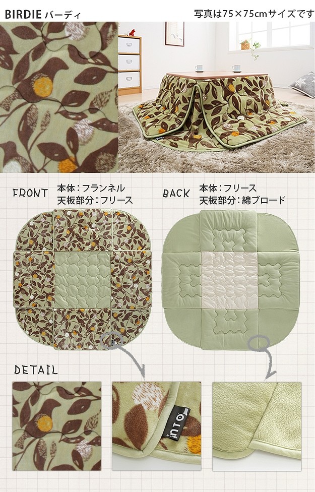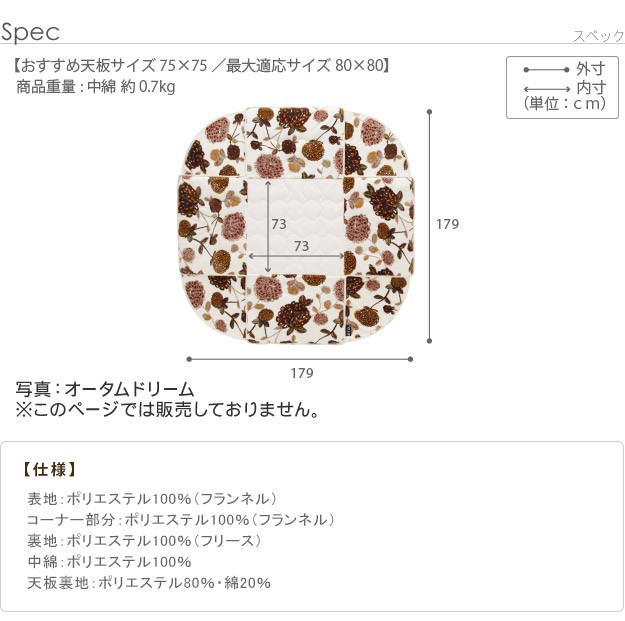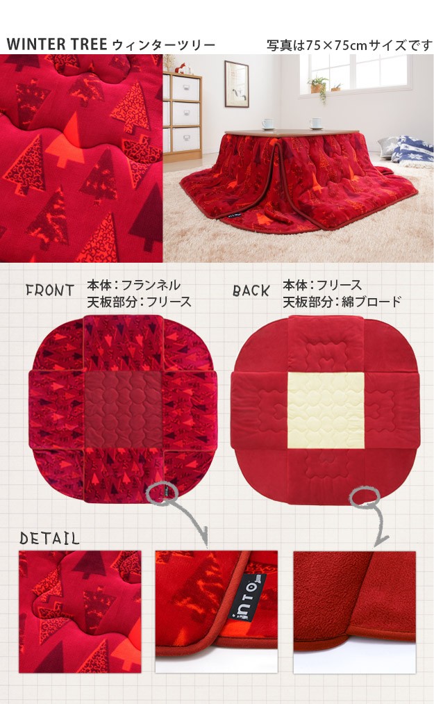 ※メーカー直送のため代金引換はお受けできません。※沖縄・一部離島は別途送料がかかります。お見積もりいたしますのでお問い合わせ下さい。【カラーバリエーション】ウィンターツリー・バーディー【仕様】表地・コーナー部:ポリエステル100%(フランネル)裏地:ポリエステル100%(フリース)中綿:ポリエステル100%天板裏地:ポリエステル80%・綿20%【サイズ】オススメこたつサイズ(約):75x75cm~80x80cm179x179cm重量:中綿量約0.7kg株式会社ナカムラ(U0100068)