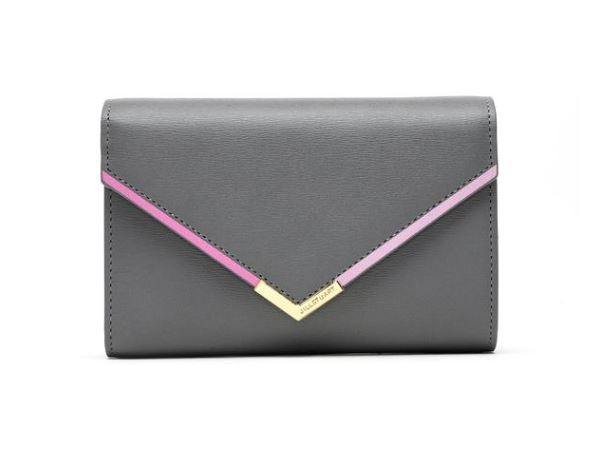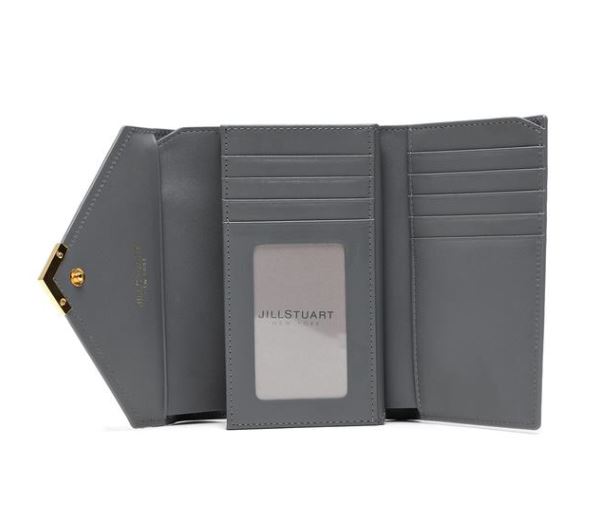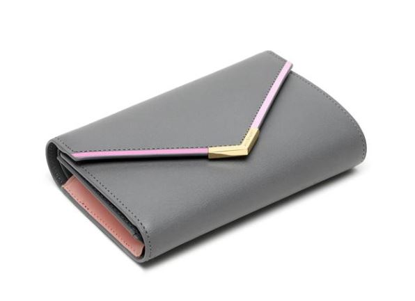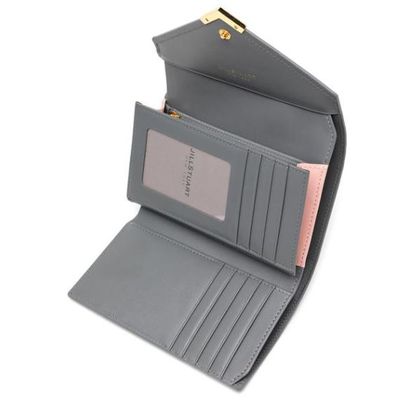 깔끔한 그레이 가죽 디자인에 핑크컬러 배색,금장 로고로 포인트를 준 3단 중지갑입니다.