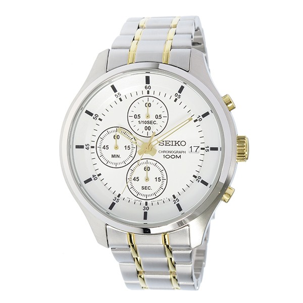 クオーツ、10気圧防水、クロノグラフ、日付カレンダー、カラー:ホワイト(文字盤)、シルバー/ゴールド(ベルト)
