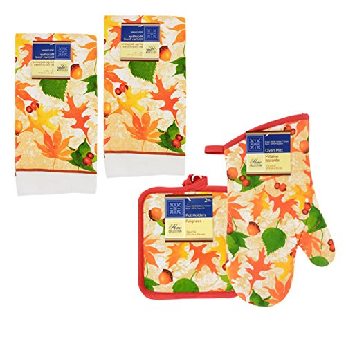 -. Feature : Home Collection 5 Piece Kitchen Linen Set / Virbant Fall Leaves/Acorns Theme! / Includes: Two (2) 15 in x 25 in Kitchen Hand Towels / Two (2) 7 in x 7 in Pot Holders and One (1) 7 in x 13in Oven Mit / Celebrate the Season with this Artful Fall Leaves/Acorns Pattern!