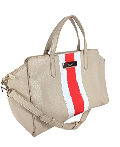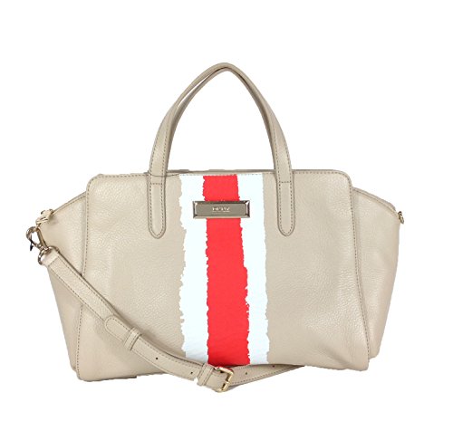 -. Feature : N/S convertible satchel in leather. / Front stripe design. Engraved logo plaque. / Duel top handles. Removable crossbody strap. Metal feet. / Top zip closure.Signature lining. Interior zip pocket & slip pockets. / 16" Wide x 6" Depth x 9"Height 4" Drop