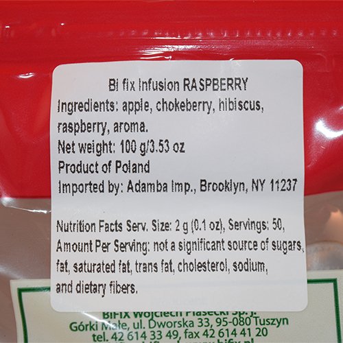 -. Feature : Delicious dried raspberry flavored infusion / To achieve the full brew keep covered for 3-8 minutes / Product of Poland / Store in a cool and dry place