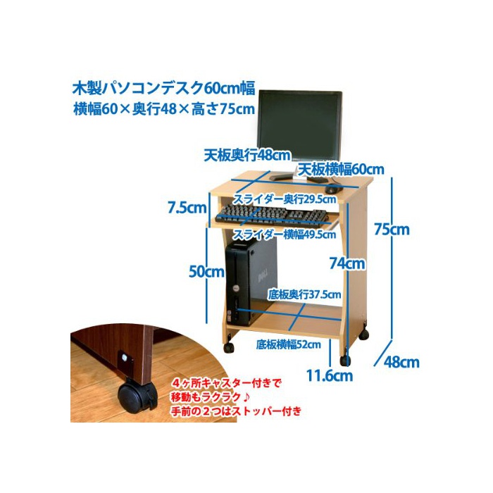 North Orange 올 우드 콤팩트궤 암갈색 나무결 60cm폭 PC 데스크 슬라이더/캐스터 부착