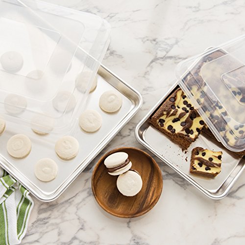 A necessity for any chef's kitchen. Bake perfect cookies and pastries without worrying about foods sticking to the pan. Baking professionals know that the secret to evenly-baked and perfectly browned food is to cook with aluminum bakeware. Aluminum is widely known for its excellent heat conductivity and cooks more evenly and thoroughly than other metals. Made of natural aluminum with no finish, the Baker's Quarter Sheet is certified for restaurant use by NSF International, the independent certification organization for public health safety and is perfect for smaller ovens. Turns out perfect results every time, whether you're making bars, brownies, or cookies. This 4 pc Combo pack includes a 13 x 18 Baker's half sheet, a 13 x 9 Bakers quarter sheet with two heavy duty see through plastic covers. These durable plastic lids make storage and transportation a breeze. Proudly made in the USA by Nordic Ware.Feature