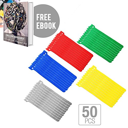 Cable Strap Net Adhesive Strap Reusable Extendable Nylon Cord Management Hook and Loop Wrap with eBook, 50-Piece, 6-Inch, Colorful
