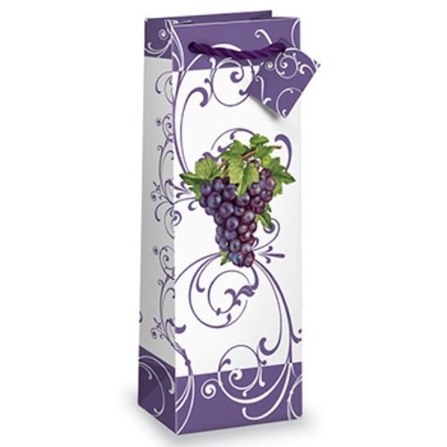 - This bottle bag is adorned with swirls and a grape bunch. It features a gift tag that is threaded onto the soft rope handle. Includes a plastic Hanging tab