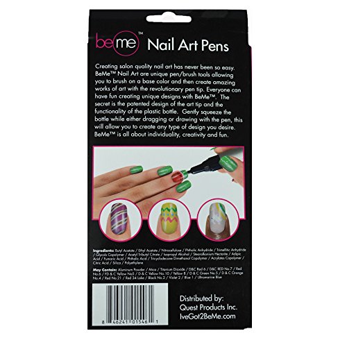 -. Binding : Health and Beauty -. Brand : Beme -. EAN : 0787461449523 -. Feature : Real nail polish with a patented art tip / Each color has both a brush and designer art tip, plastic squeeze bottle, free refills and replacements / Easy to use, not messy, fun for diy nail art, hold it like a pen, draws like a pen / Each kit has 8 colors -. IsAdultProduct : 0 -. Label : BeMe -. Manufacturer : BeMe -. Model : NA -. MPN : QNA01546 -. NumberOfItems : 1 -. PackageQuantity : 1 -. PartNumber : QNA01546 -. ProductGroup : Beauty -. ProductTypeName : BEAUTY -. PublicationDate : 2014-11-28 -. Publisher : BeMe -. ReleaseDate : 2015-03-12 -. Studio : BeMe -. Title : BeMe Nail Art Pens Blooming Color Collection, 4 Count -. UPC : 846241015461