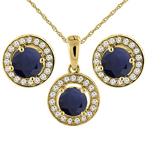 -. Title : 14K Yellow Gold Natural HQ Blue Sapphire Earrings and Pendant Set with Diamond Halo Round 5 mm